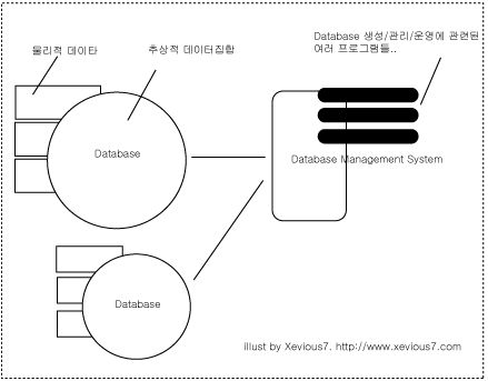 데이터베이스는 사실상 추상적인 개념에 더 가깝습니다. 물리적으로는 결국 이진데이타이며 파일시스템의 파일들입니다. 이러한 데이타베이스를 손쉽게 만들고 관리하는 여러가지 프로그램들이 모여서 하나의 시스템으로 갖추어져 있는 프로그램을 데이타베이스관리시스템(DBMS)라고 합니다.