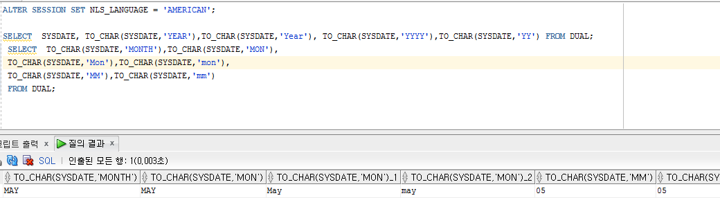 세션을 다음과 같이 바꾼 후 실습을 진행하면 5월이 MAY로 변경된 것을 확인할 수 있음.