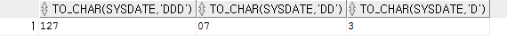select to_char(sysdate,'DDD'), to_char(sysdate,'DD'), to_char(sysdate,'D') FROM DUAL;