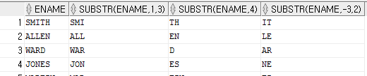 select ename, substr(ename,1,3), substr(ename,4), substr(ename,-3,2) from emp;