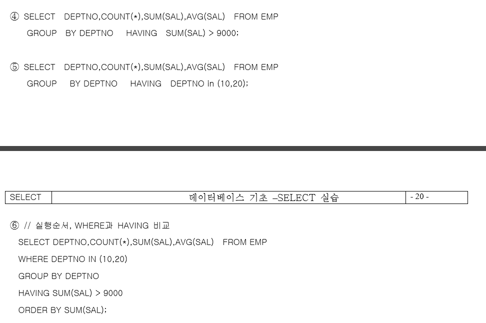 GROUP BY의 결과에 대한 조건문이 HAVING임!!!!!!!!!!!!!!!!!!!!!