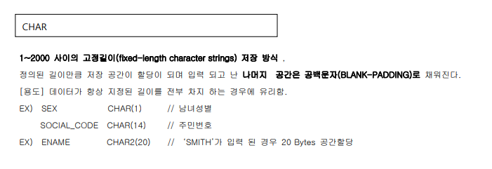 예를 들어, ENAME에 SMITH로 저장되면 나머지 공간은 공백문자로 채워진다.