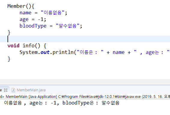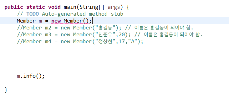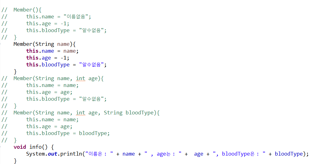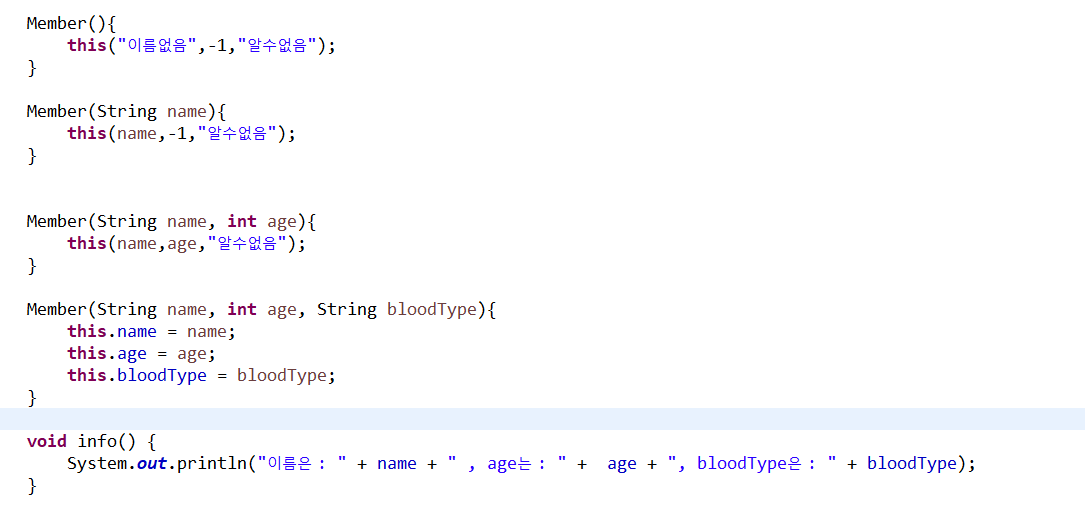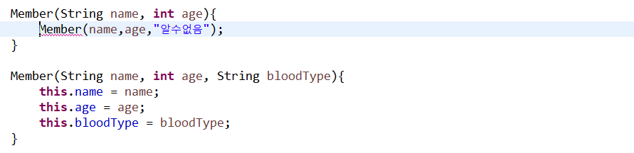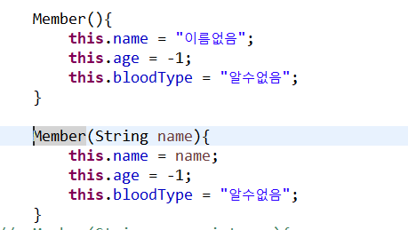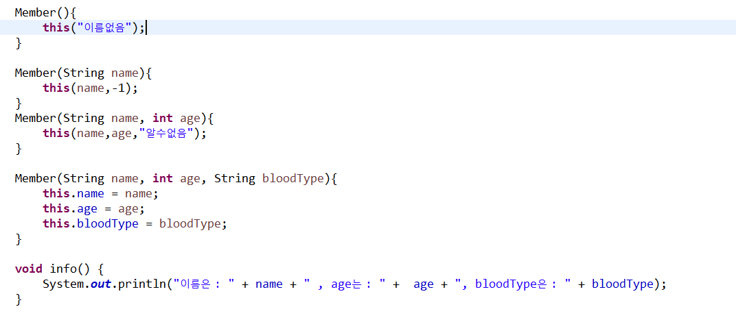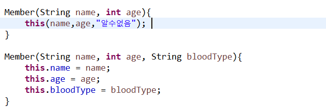 제일 중요한 것은 this(name,age,"알수없음"); 이 구문은 반드시 생성자의 제일 첫 줄에 있어야 함.
