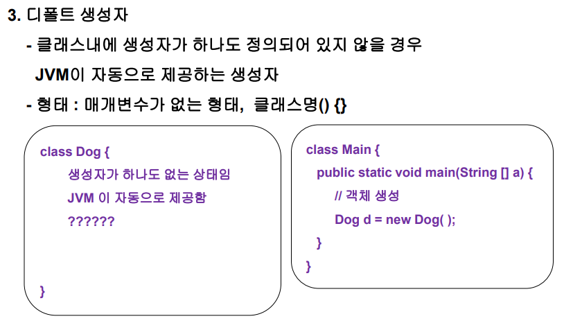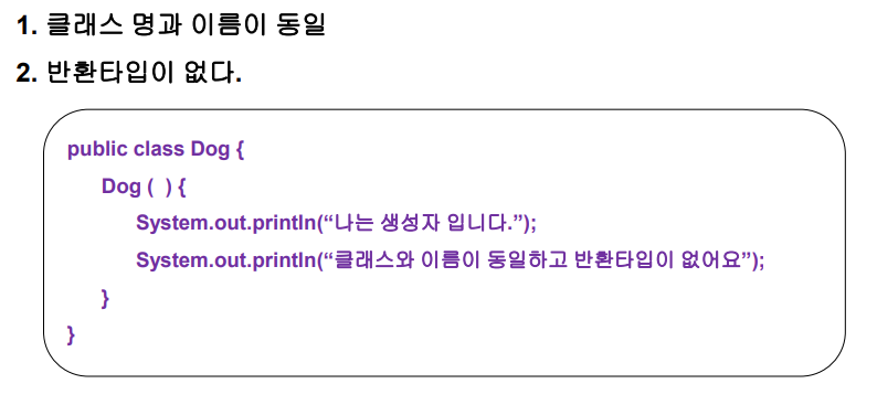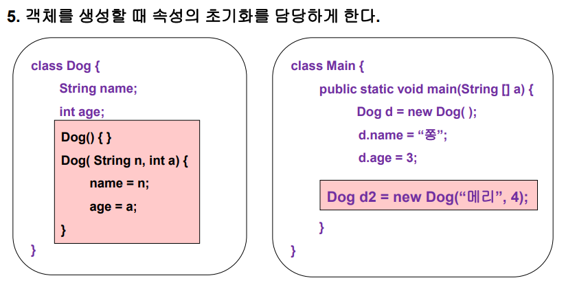 생성자는 인스턴스 객체를 만들 때 임의의 값으로 초기화하기 위해 사용한다.