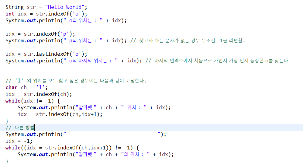 // 문자열을 탐색 -> 내가 찾고자 하는 문자가 어디 있는지 찾고 싶을때