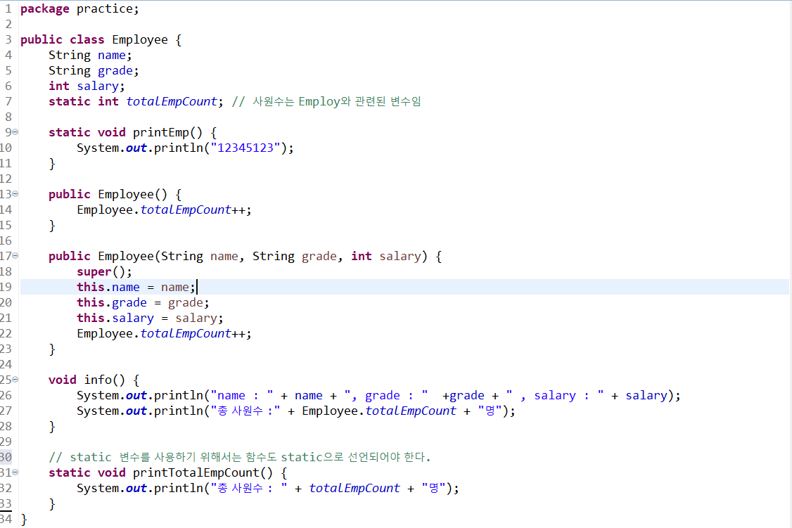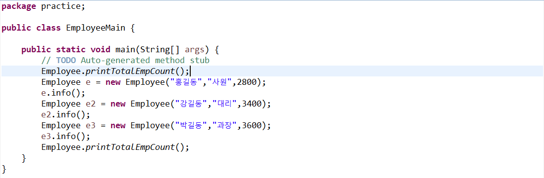 2. static 변수를 사용하기 위해서는 totalEmpCount 직접 클래스명을 적어준다.