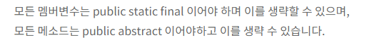인터페이스는 접근 제한자를 사용하지 않으면 무조건 public이다.