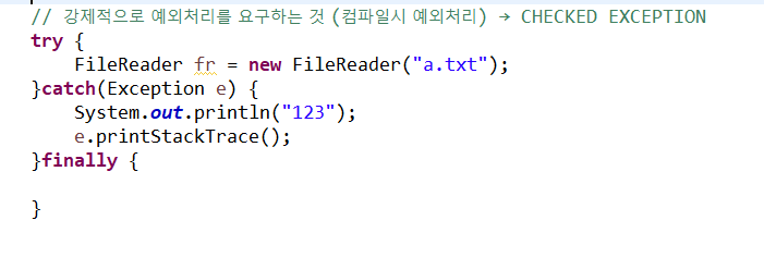 파일 입출력 같은 경우 try/catch를 개발자에게 요구하는 것을 CHECKED EXCEPTION 이라고 함.