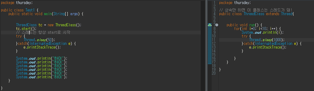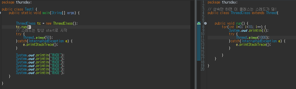 스레드로 쓸려면 run() 메소드로 호출하는 것이 아니라, start() 메소드로 해주어야 함. (비동기적)