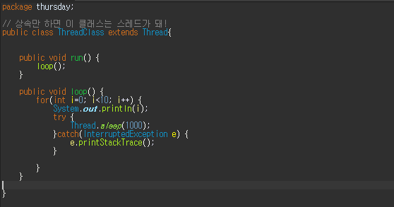 예를 들어, tc.loop() 를 메인 메소드에서 호출할 경우 loop() 함수는 thread로 돌아가지 않는다.