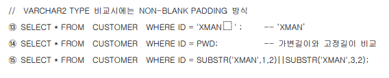 14번의 경우 VARCHAR2 와 CHAR 비교시 VARCHAR2가 이김 -> 데이터가 조회되지 않음