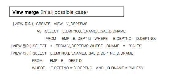 [VIEW 처리] 부분을 보면 뷰에 대한 정의와 뷰의 질의 부분을 MERGE하여 실행한다. - 시험