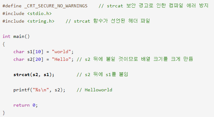strcat 함수로 문자열 포인터 s2 뒤에 문자열 포인터 s1을 붙였습니다.