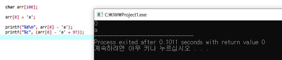 0이랑 97을 더하면 97 => 문자로 출력하면 'a'