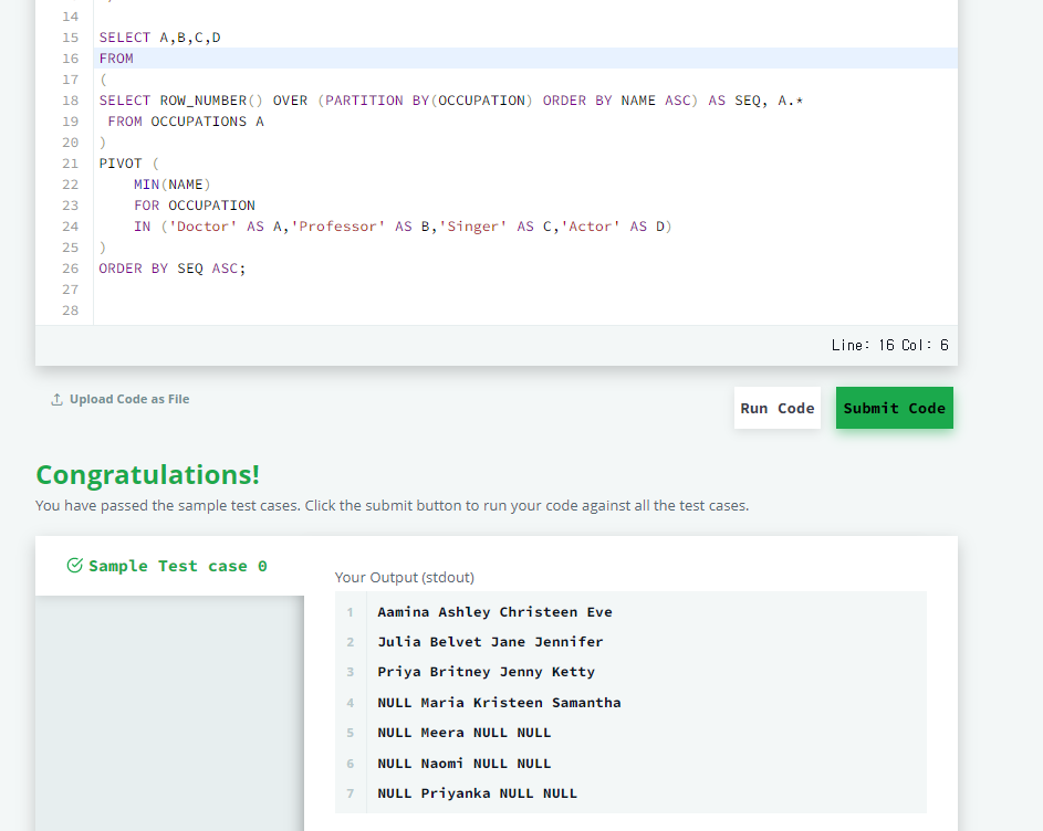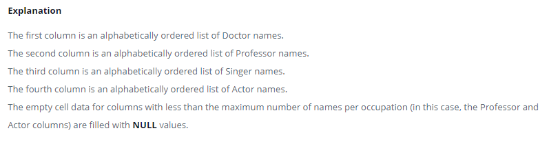 Pivot the Occupation column so the Name of each person in OCCUPATIONS is displayed underneath their respective Occupation.