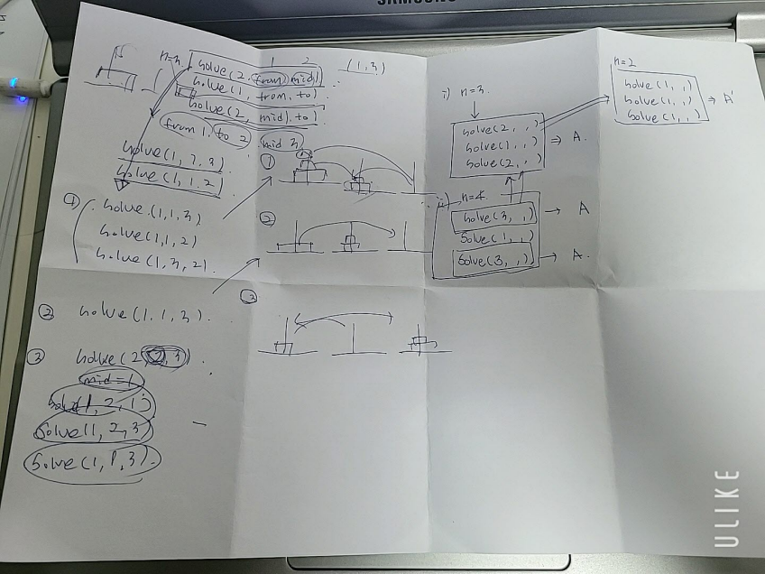 1. 가장 밑 원반을 옮기기 전에 그 위 n-1개의 원반을 빈 곳(=미드) 로 옮긴다. (단,미드는 매번 바뀐다)