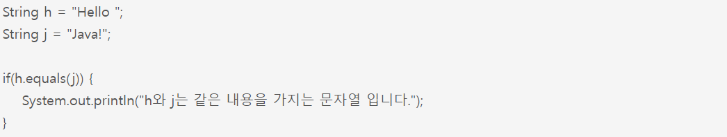 String 객체를 비교할 때는 equals() 메소드를 사용합니다. 기본 타입이 같은지 비교할때 사용되는 == 연산자를 사용하여 객체를 비교하게 되면 객체가 존재하는 메모리상의 주소가 같은지를 비교하게 되어서 잘못된 결과를 보게 될 것입니다. 객체인 String 을 비교할 때는 equals() 메소드를 사용합니다.