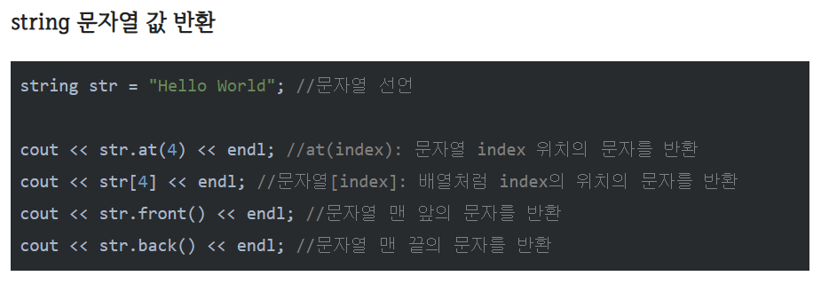 문자열을 배열처럼 []로 접근하는 것이 가능하고, at으로도 사용이 가능하다. front() 는 문자열의 첫번째 값을 리턴해주는 함수이고 back()은 문자열의 마지막 값을 리턴해주는 함수이다.