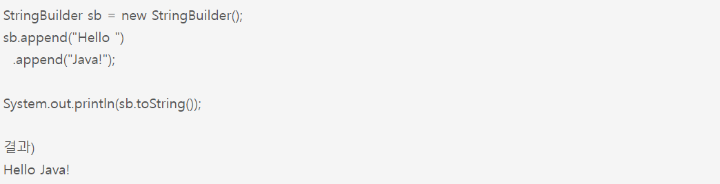 StringBuffer와 StringBuilder 객체의 차이점은 StringBuffer 객체의 메소드는 synchronized 되어 있어서 다중 쓰레드에서 안전하고, StringBuilder는 synchronized 되어 있지 않아서 다중 쓰레드 환경에서는 사용할 수 없지만 싱글 쓰레드 환경에서 동기화 오버헤드가 없으므로 더 빠르게 동작합니다. 그래서 대부분의 경우 StringBuilder를 사용합니다.