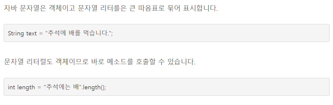 자바 문자열은 객체이고 문자열 리터를은 큰 따옴표로 묶어 표시합니다. String text = "추석에 배를 먹습니다."; 문자열 리터럴도 객체이므로 바로 메소드를 호출할 수 있습니다. int length = "추석에
