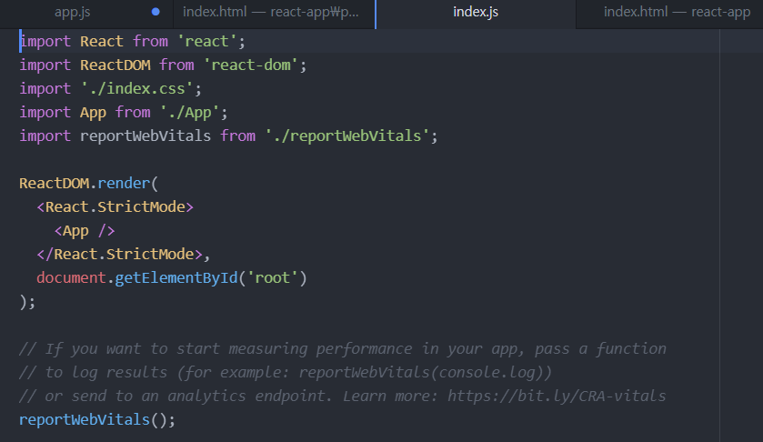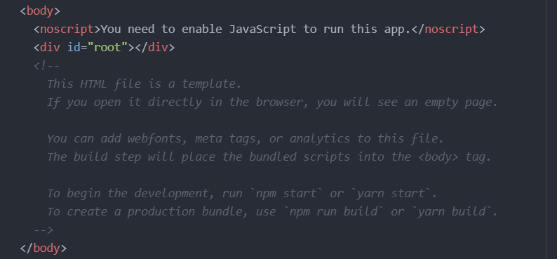 index.html에서 주의깊게 봐야 하는 것은 div id가 root 라는 것
