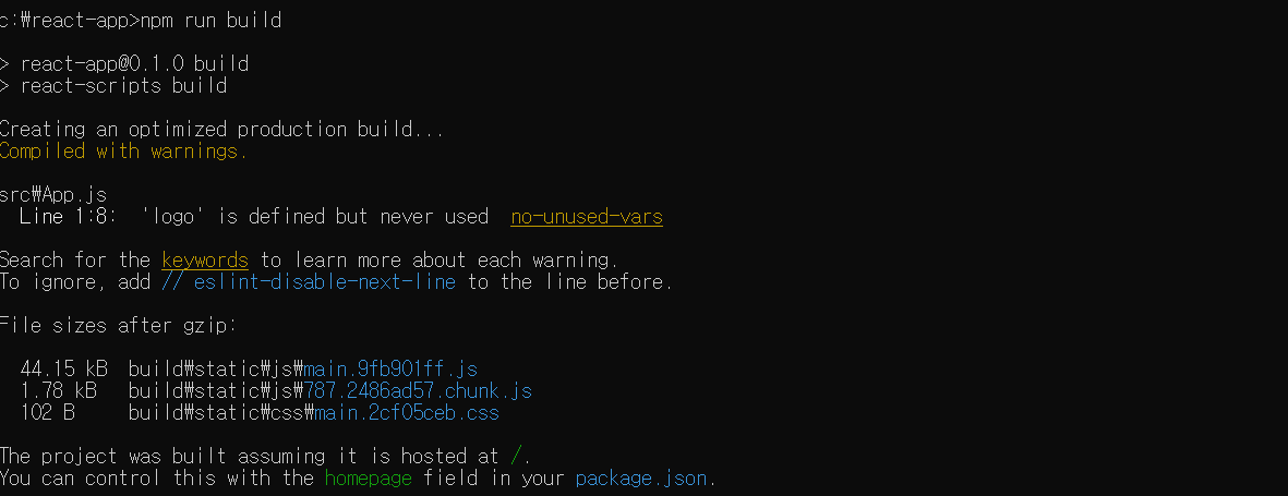 하면 build 디렉토리가 react-app 디렉토리 안에 생성되고, 거기에는 새롭게 생성된 index.html 를 확인할 수 있다.