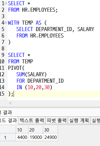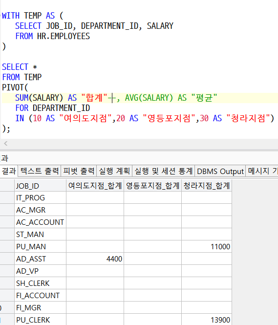 즉, GROUP BY 할 대상들만 서브쿼리 또는 WITH 절로 묶어서 추려낸 뒤에 PIVOT을 해주어야 한다.